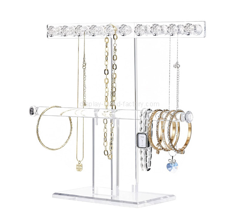 Custom acrylic 2-tier necklaces holder organizer designed for neat, layered presentation of multiple necklaces. Made from durable, crystal-clear acrylic with smooth polished edges, it prevents tangling while maximizing display space. Ideal for jewelry stores, boutiques, showcases, and trade shows, delivering a clean, modern, and professional look.