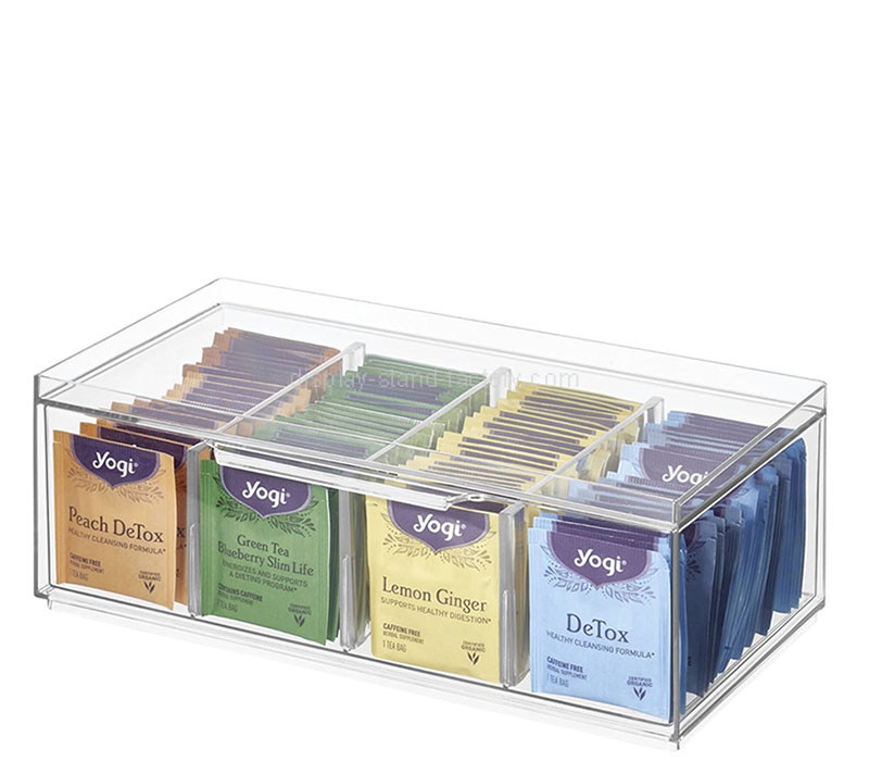 カスタムアクリル製ティーバッグ収納ボックス(4区画)。様々な種類の茶葉を整理するのに最適です。高品質な透明アクリル製で、耐久性と洗練されたモダンデザインを兼ね備え、キッチン、カフェ、オフィスなどで手軽に取り出せ、整然と収納でき、優雅に展示できます。.
