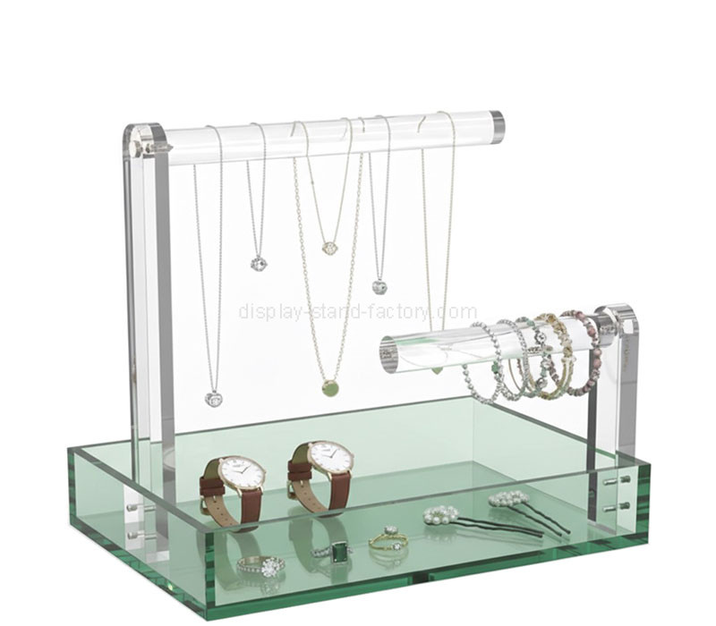 Custom acrylic jewelry bars with a translucent green storage tray, designed for elegant and organized display of necklaces, bracelets, watches, and rings. Crafted from premium clear and colored acrylic, it offers excellent visibility and stability, ideal for jewelry stores, boutiques, showcases, and trade shows.