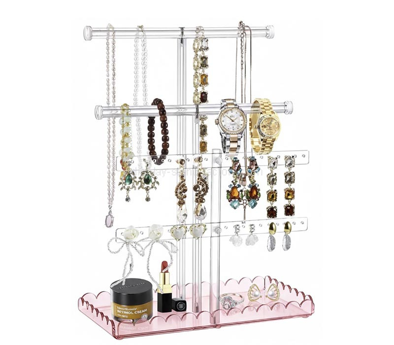 This custom acrylic jewelry stand features a translucent pink scalloped tray, combining charm and practicality. Perfect for organizing rings, earrings, and bracelets, it keeps your jewelry accessible and tangle-free. Made from high-quality acrylic, it’s durable, stylish, and ideal for personal use, retail displays, or boutique showcases.