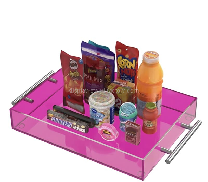 은색 손잡이가 달린 맞춤형 반투명 핑크 아크릴 호텔 서빙 트레이로 호텔, 카페 또는 가정에서 우아한 식음료 서비스를 제공하는 데 이상적입니다. 내구성이 뛰어난 고품질 아크릴로 제작되어 세련되고 모던한 외관을 자랑합니다. 세척이 간편하고 오래 사용할 수 있습니다. 올인 배송 포함, 추가 세금 없음.