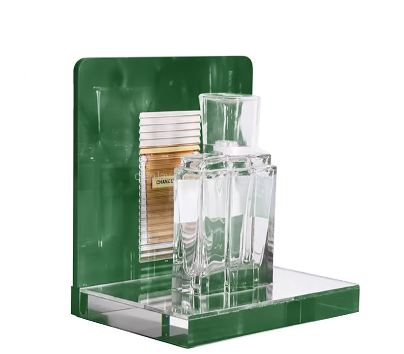 Custom green acrylic L-shaped perfume display stand with a printed backboard delivers a clean, modern look for retail environments. The sturdy acrylic structure ensures stability, while the vertical backboard enhances branding and product focus, making it ideal for showcasing perfumes in boutiques, counters, and promotional displays.