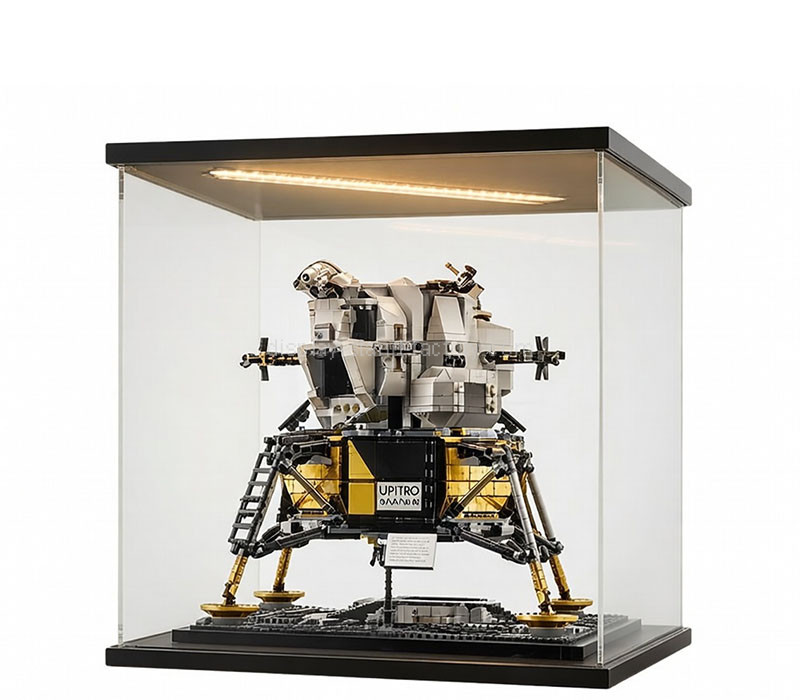 Custom acrylic memorabilia LEGO sets LED display box with sleek black top and base, designed for collectors and retailers. Crafted from high-clarity acrylic, it offers dust protection and crystal-clear visibility. Built-in LED lighting enhances details, making LEGO models stand out beautifully in homes, stores, exhibitions, and display showcases.